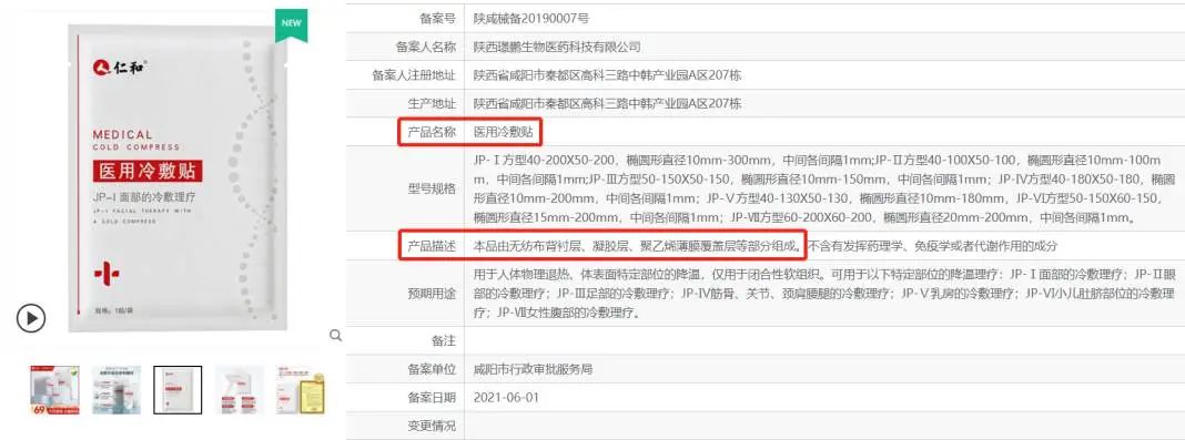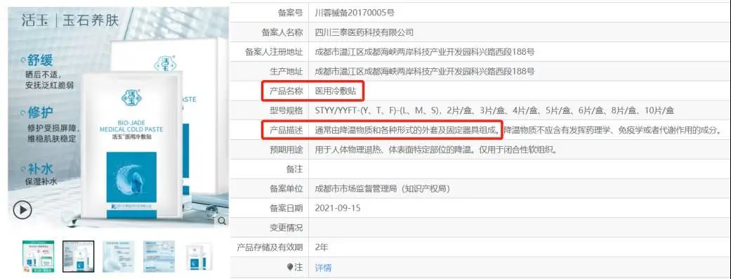 记者随机查询发现,仁和医用冷敷贴(陕咸械备20190007号)、活玉医用冷敷贴(川蓉械备20170005号)、科优妍医用冷敷贴(浙湖械备20190053号)、卡其芙医用冷敷贴(粤穗械备20210950号)等产品都存在不同程度的问题,比如:仍然使用“医用冷敷贴”等产品名称、成分备案不完整。