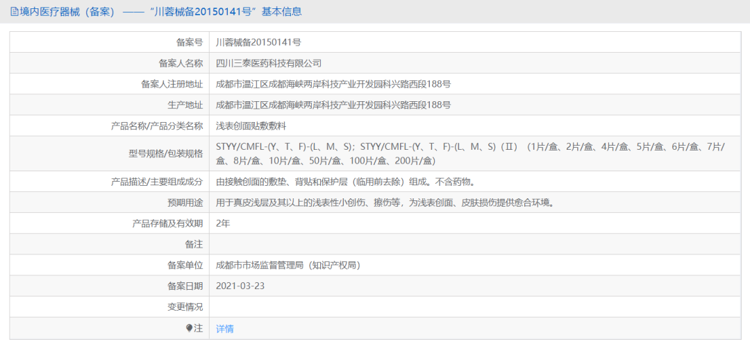 根据备案号搜索到的信息显示,这款产品的名称为“浅表创面贴敷敷料”,“由接触创面的敷垫、背贴和保护层(临用前去除)组成,含药物”,预期用途为“用于真皮浅层及其以上的浅表性小创伤、擦伤等,为浅表创面、皮肤损伤提供愈合环境”。