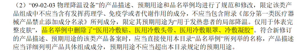 与行业相关的重点包括,针对第一类医疗器械,国家药监局限定了09-02-03物理降温设备的产品用途和范围,删除“医用冷敷贴、医用冷敷头带、医用冷敷眼罩、冷敷凝胶”的品名举例,删除了液体敷料、膏状敷料的有关内容。