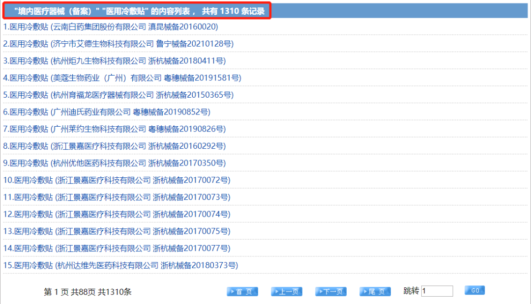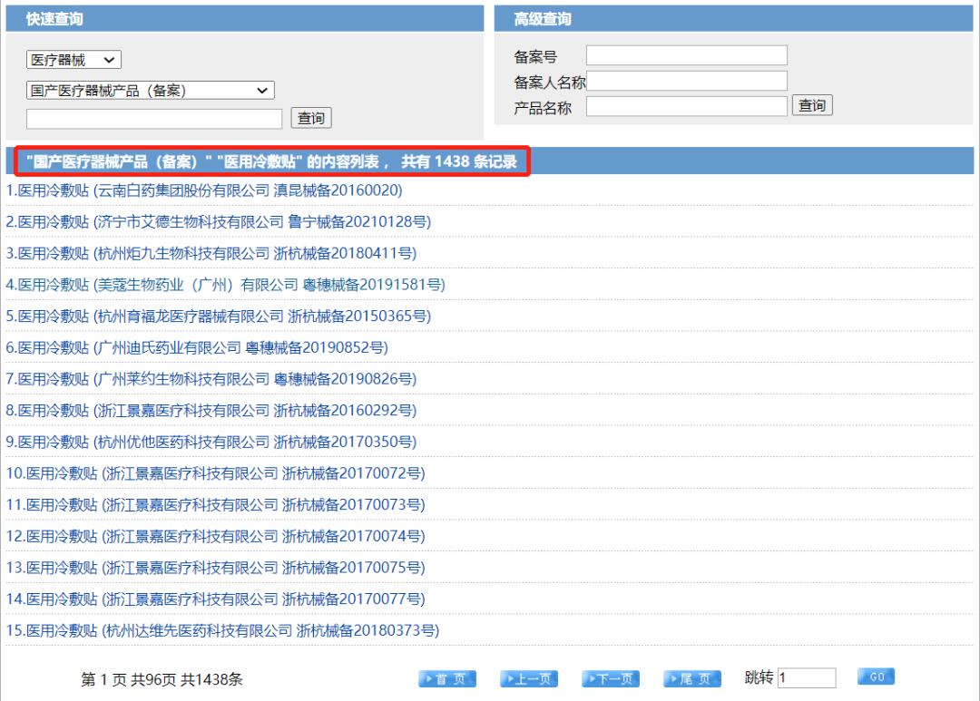 而在市场端,以天猫平台为例,目前仍然有许多第一类医用冷敷贴在售。但根据其中部分产品的备案号,记者在药监局官网中搜索发现,存在搜索不到备案信息的情况。
