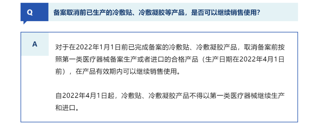而4月11日,广东省药品监管局在官方公众号“广东药监”发布文章表示,对于在2022年1月1日前已完成备案的冷敷贴、冷敷凝胶产品,备案取消前按照第一类医疗器械备案生产或者进口的合格产品(生产日期在2022年4月1日前),在产品有效期内可以继续销售使用。
