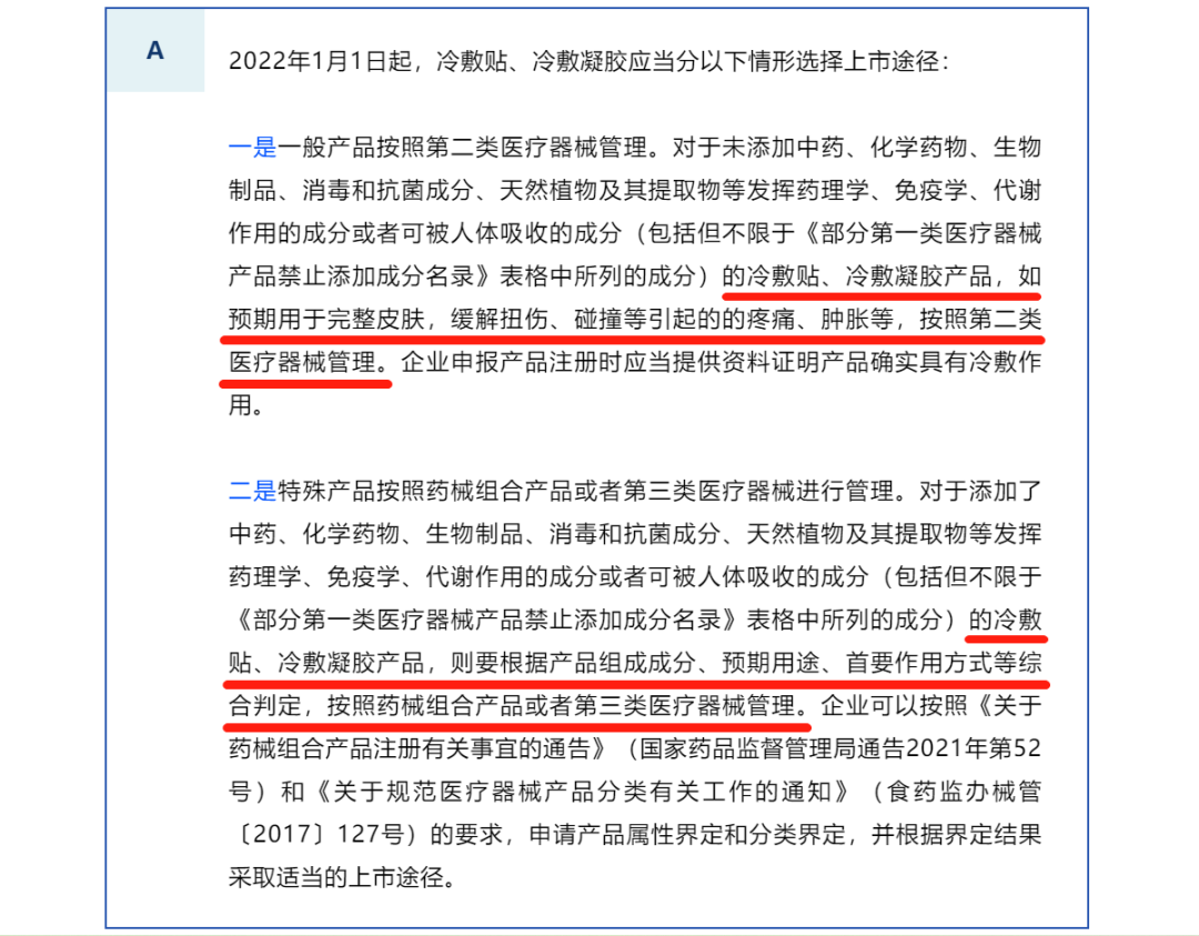 另外,在这篇文章中,国家药监局器械注册司、器械监管司相关负责人还解答了“新《一类目录》实施后,冷敷贴、冷敷凝胶产品,应当采取什么途径上市?”这一问题。解答内容显示,“一般产品按照第二类医疗器械管理”,“特殊产品按照药械组合产品或者第三类医疗器械进行管理”。