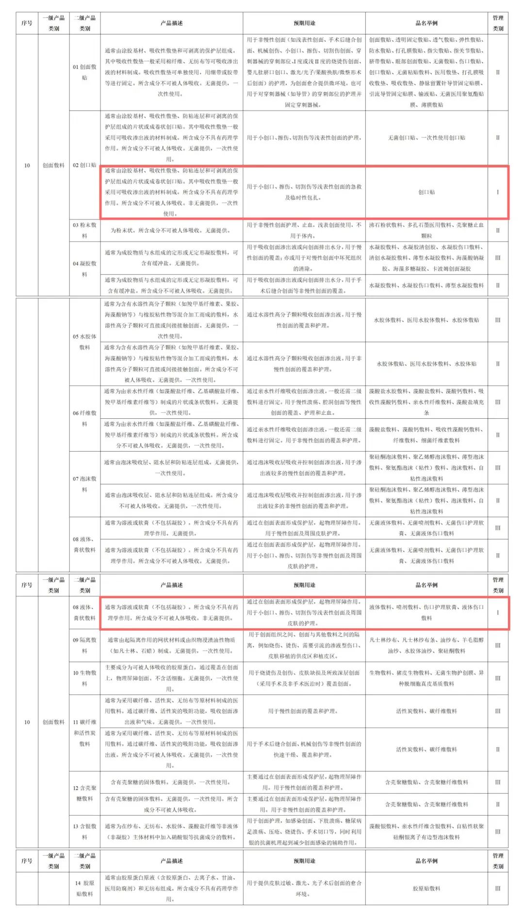 但记者查询了2017版的《医疗器械分类目录》,发现在用于创面护理的14-10创面敷料分类中,绝大多数的医疗器械都需要以二、三类来进行注册,如下图所示,可以以第一类医疗器械备案只有14-10-02创口贴和14-10-08液体、膏状敷料。