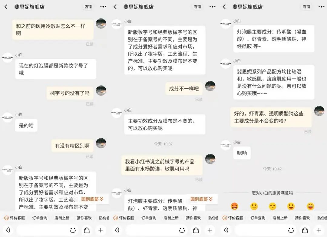 记者向店铺客服咨询后对方表示,“新版妆字号和经典版械字号的区别在于备案号的不同,主要是为了成分爱好者需求和应对市场,所以出了妆字版,工艺流程、生产标准、主要功效及膜布是不变的”。