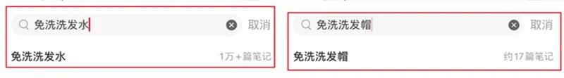 第四类是“免洗洗发水/帽”。与“免洗洗发水”这个词条相关的小红书笔记高达8000+篇,但“免洗洗发帽”仅17篇。