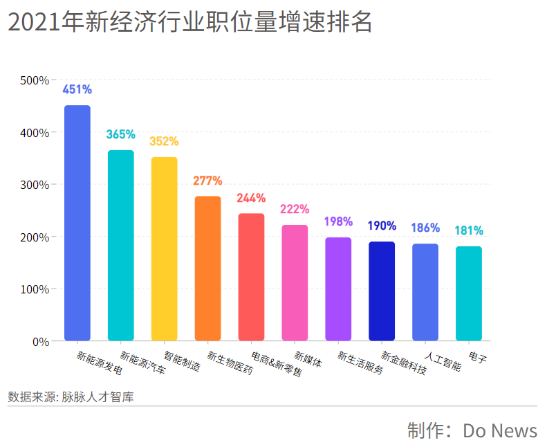 根据脉脉人才智库数据显示,在2021年新增职位量最多的新经济行业中,新能源汽车行业高居亚军,新增职业量同比增长365%。