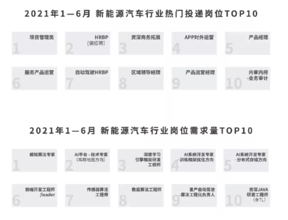根据脉脉研究院发布的《新能源汽车人才启示录》可知,去年上半年汽车行业需求量最大的岗位,是感知算法专家、AI平台技术专家、深度学习引擎框架研发工程师等研发岗位。但投递量最大的岗位,则是项目管理、HR、商务拓展等非研发岗,供需脱节。