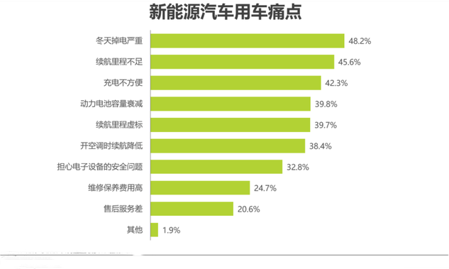 其次,用户体验是另外一个重要的方面。目前新能源车部分技术仍然不成熟,比如续航里程短,在北京开车出趟远门,路上得找有充电桩的路线走,不如燃油车各地密集分布的加油站合适。另外充电桩的数量,充电时长等问题也被消费者诟病。冬天电池里程衰减过快,有用户说去远一点的地方,开空调都得省着用。维护保养费用较高,售后服务也不如燃油车做的好。