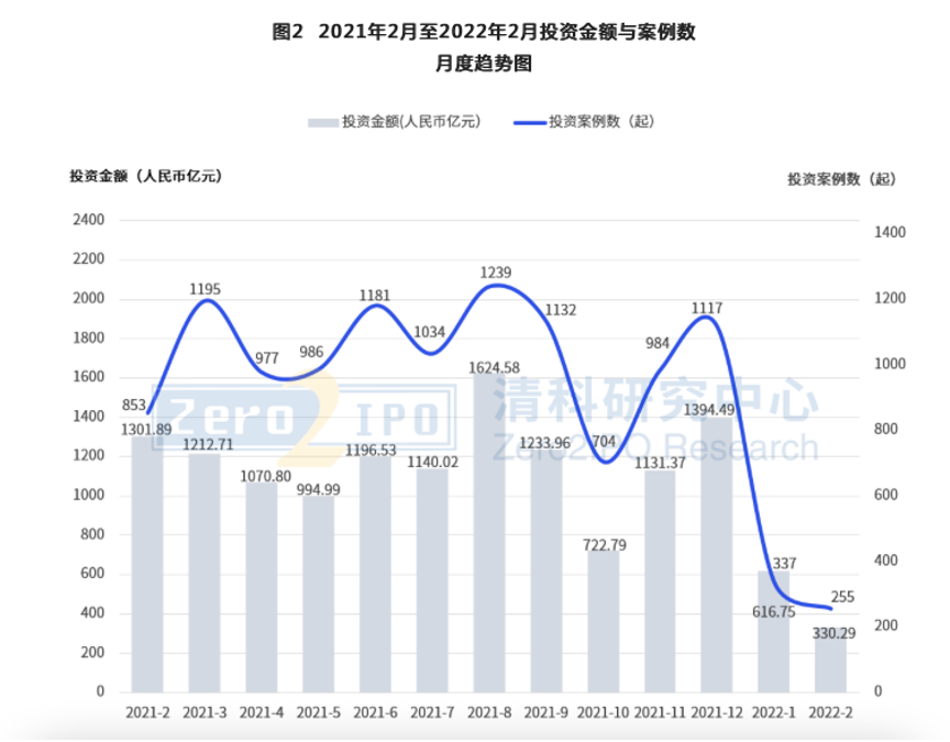 到了2月,仅发生255起投资案例,同比下降70.1%;其中披露金额案例221起,共涉及投资金额330.29亿人民币,同比下降74.6%。