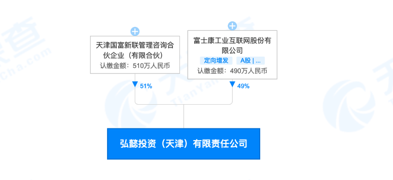 4月12日,弘懿投资(天津)有限责任公司成立,注册资本1000万元人民币,由天津国富新联管理咨询合伙企业(有限合伙)、工业富联共同持股,二者持股比例分别为51%、49%。