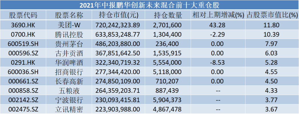 鹏华创新未来混合失去蚂蚁战投优势后,也一度重仓白酒股。2020年末至2021年三季度,该产品前十大重仓股均持有贵州茅台、古井贡酒等,直至2021年末,白酒股才全部退出前十大重仓股。