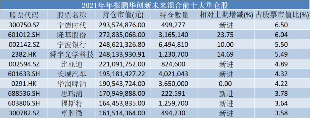 值得一提的是,在鹏华创新未来混合2021年年报中,王宗合还表示,“2022年,由于目前市场估值水平的问题,我们一方面在细分产业和个股上延续做深度研究和储备,另外也会防范一些高估值板块大幅波动给组合带来的影响,防范高估值个股带来的股价风险。”