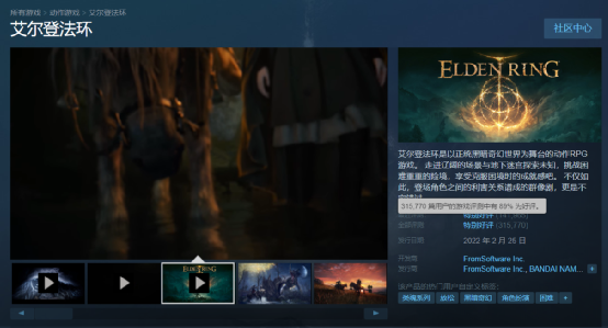 早就在黑魂中感受过“宫崎英高的恶意”的老玩家们,已经习惯了这样的游戏体验,甚至有不少玩家对游戏的高难度给出了好评:就是这个味道!实际上,艾尔登法环的困难要素并没有影响玩家对这款游戏的评价,时至今日,游戏在Steam平台上的玩家评测已经超过了30万条,其中好评率将近90%。