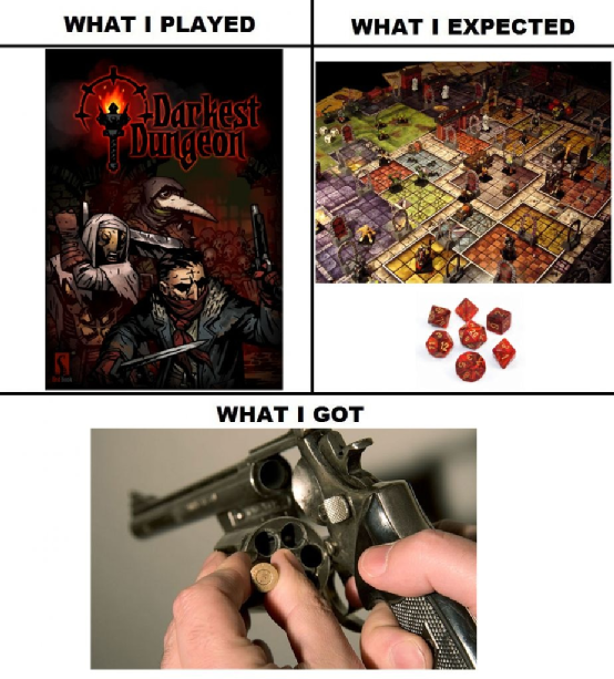 这样的现象在《暗黑地牢》这样的回合制游戏中更为明显,但玩家习惯于看到队伍里奄奄一息的英雄被集火、关键的攻击总是失误未命中、承受不了压力的队员崩溃混乱种种情况之后,偶然出现的好运气更能让玩家感到振奋和欣喜。可能是一记暴击解决了本可能团灭小队的棘手敌人,抑或是英雄顶住了压力触发英勇的Buff,这些概率事件都足够让玩家欢呼雀跃,而如果没有低容错率和高失败惩罚对玩家施加压力,这样的体验也无从谈起。