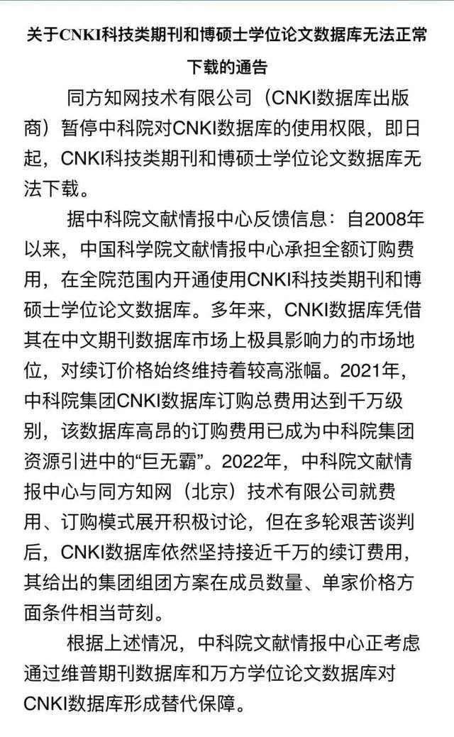 在“中科院停用知网”消息传出之后,据红星资本局的报道,4月17日中科院负责人已经回应消息属实,其表示自2022年4月20日起,中科院将停用CNKI数据库,且至少在今年应该都没有计划恢复对知网的访问。