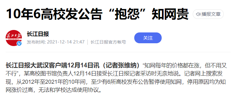 事实上,知网的“贵”已经不是一天半天的事,2021年底,长江日报曾发新闻称, 10年间已有6所高校“抱怨”知网太贵,包括武汉理工大学、北京大学、太原理工大学、南京师范大学等高校都曾一度停用知网。