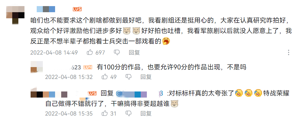 此不难看出,炒CP吸引女性观众和粉丝控评、过度营销都不能拯救一部军旅题材电视剧的真实口碑。因为对于军旅剧的受众而言,观众想看的是真实的、硬核的军旅故事,即对真实军旅生活的展示,对军事训练和真实战斗的高度还原,而非花拳绣腿班门弄斧,或你侬我侬谈情说爱不做正事。