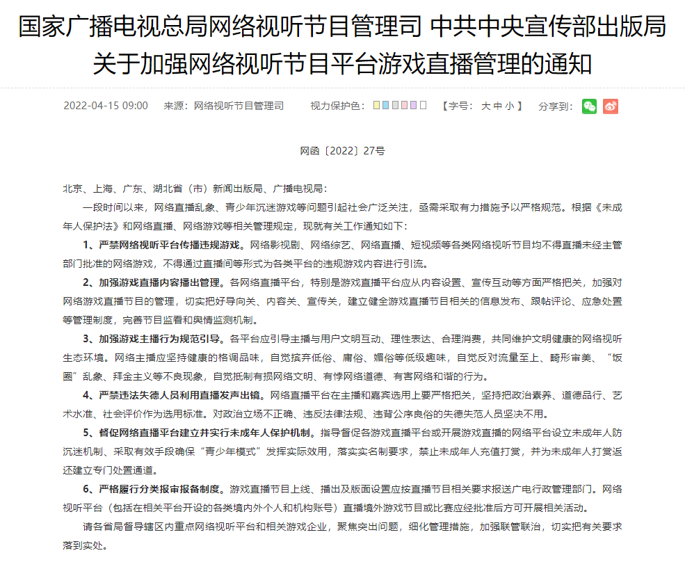 另一方面,从2018年以来游戏行业的未成年人保护监管力度空前,近期还下发了被称为“史上最严防沉迷”的《关于进一步严格管理切实防止未成年人沉迷网络游戏的通知》。此次对游戏直播的规范,很大程度上是对未保工作进行进一步完善。