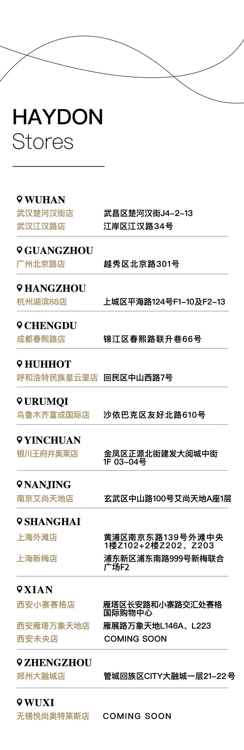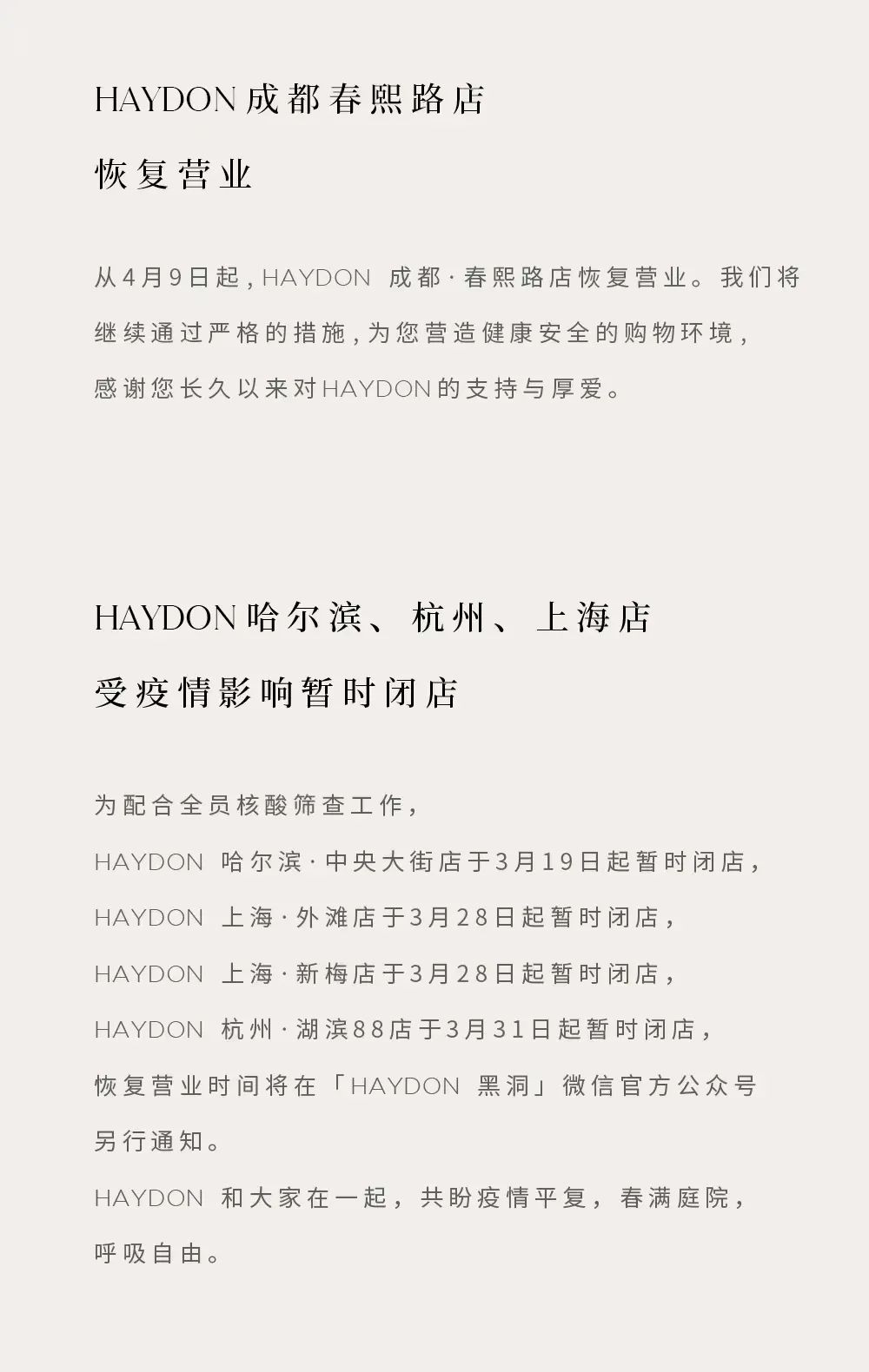 据HAYDON黑洞官方微信公众号公布,受疫情影响,HAYDON黑洞自3月起便陆续关闭了部分门店,日前成都春熙路店已恢复营业,但杭州湖滨88店、哈尔滨中央大街店、上海外滩店以及新梅店仍处于暂时闭店状态。