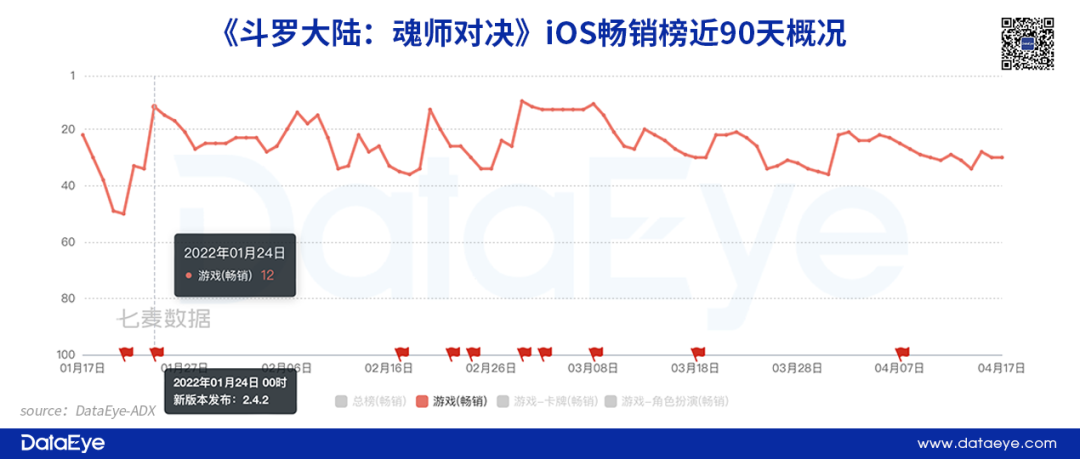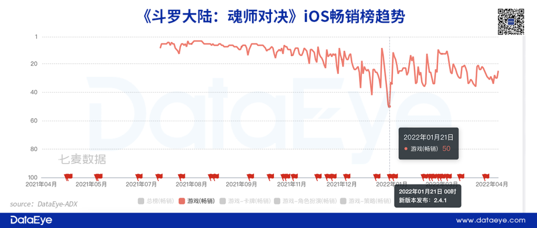 以《斗罗大陆:魂师对决》为例,从数据来看,《斗罗大陆:魂师对决》在2022年第一季度日均开启22场直播,最高曾在1月22日拿下703万的点赞数。这场直播也让《斗罗大陆:魂师对决》从iOS畅销榜50名的位置瞬间攀升至12名。