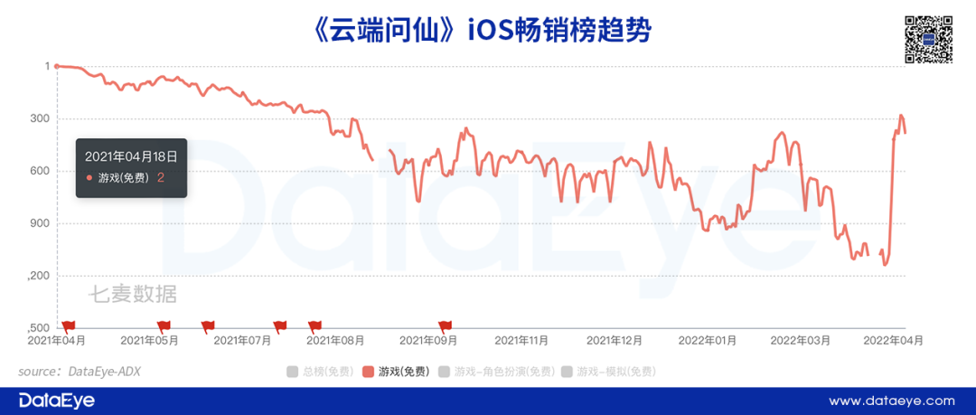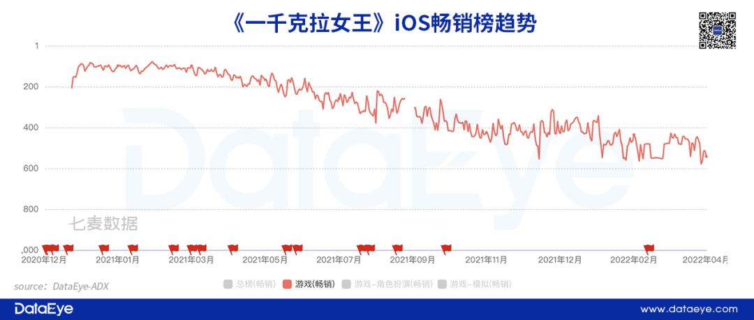 《云端问仙》、《一千克拉女王》也是相同的情况,在上线初期取得不错成绩后,后续畅销榜表现明显下滑。