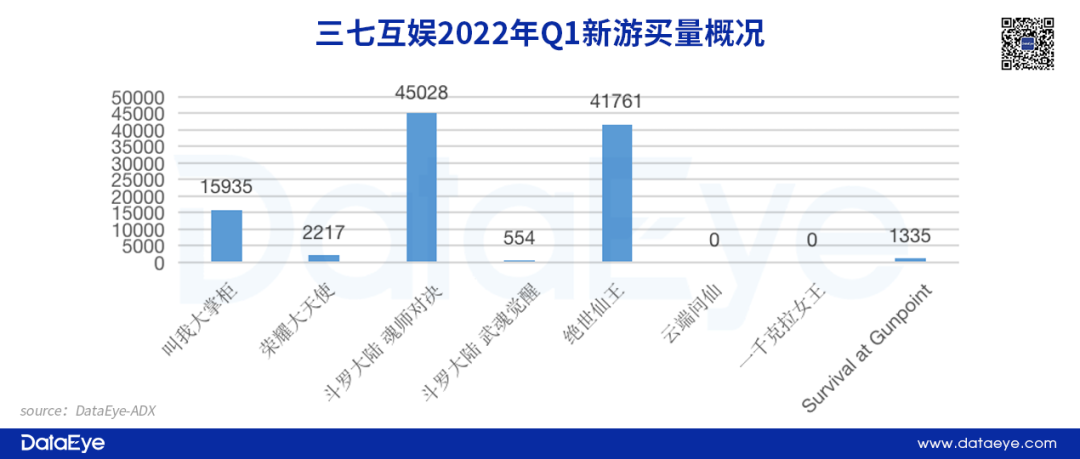 从数据来看,2022年第一季度,三七互娱的投放重心侧重在《叫我大掌柜》、《斗罗大陆:魂师对决》、《绝世仙王》三款产品,后两者的一季度素材投放数均超过了4万组。而《云端问仙》、《一千克拉女王》两款产品,三七互娱已不再买量。三七互娱在2021年上线了两款“斗罗大陆”IP,如今投放重心明显倾斜在《斗罗大陆:魂师对决》之中。