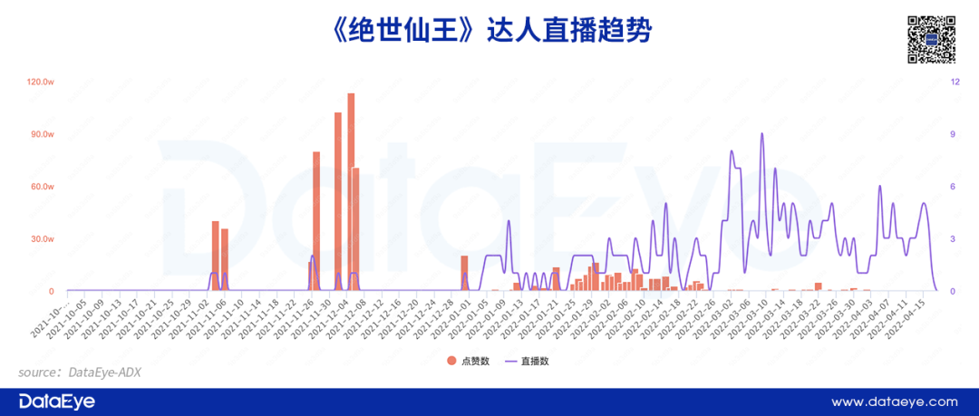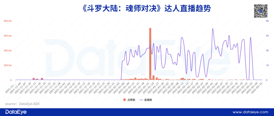 DataEye-ADX监测发现,三七互娱在2021年底时就曾对《绝世仙王》、《斗罗大陆:魂师对决》两款产品尝试达人直播营销,并在2022年第一季度加大了达人直播板块的投放。