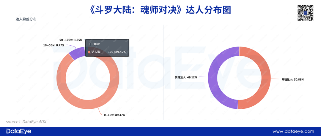 《斗罗大陆:魂师对决》在今年一季度邀请了114名达人主播,其中102名为0-10万粉丝数的主播,占比89.47%,百万粉丝量以上的主播则并不在《斗罗大陆:魂师对决》考虑范围,其中常驻达人以及其他达人各占50%。