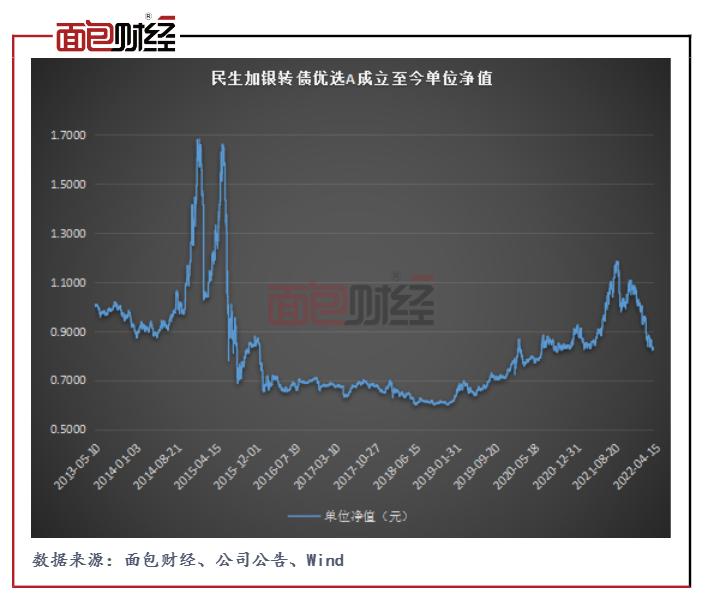 民生加银转债优选A(基金主代码:000067,以下简称“转债优选”)是民生加银基金旗下的混合债券型基金,截至2021年末,该基金资产净值约1.55亿元。2022年年初至今(截至2022年4月17日,下同),转债优选复权单位净值下跌22.93%,单位净值再度跌至1元以下,为0.83元。