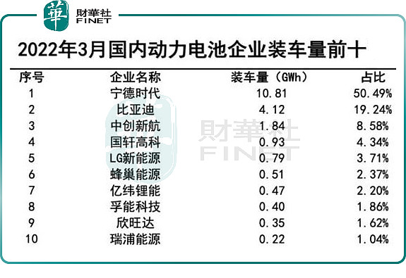 排名前三位的依然是宁德时代、比亚迪和中创新航,与2月一致。