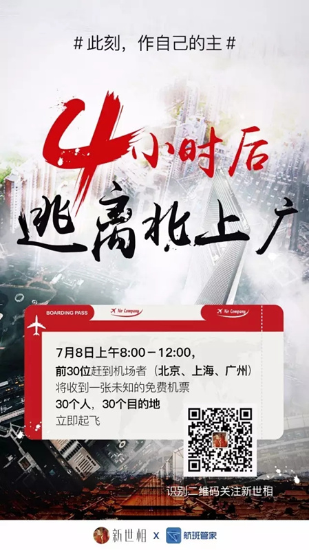 没想到,这篇看似标题党的文章是来真的。这是公众号“新世相”联合航班管家一起做的一次有点像“快闪”的推广活动。从文章推送时间开始计算,只要读者在4小时内赶到北京、上海、广州3个城市的机场,他们就送往返国内一个目的地的机票,还有300块的酒店补贴。