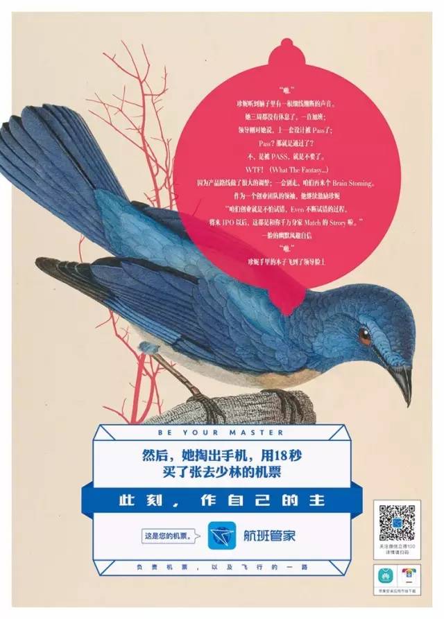 这场活动无意让航班管家火了。在这家刚获得C轮融资的旅行平台最近推出的一系列广告中,文艺范儿是它在想要突出的品牌形象。比如早在几天前,航班管家的品牌宣传就在北上广的电梯间里开始骚动了。颇有中国风的海报设计,用不同鸟的元素搭配一则长故事。