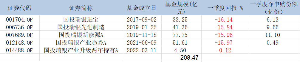 不过,从基金规模和申购赎回份额来看,虽然业绩为负,但投资者仍在买买买。国投瑞银新能源一季度的净申购份额为11.1亿份,国投瑞银先进制造的净申购份额为9.66亿份,国投瑞银进宝的净申购份额为6.13亿份。