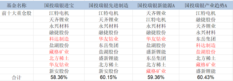 从持仓来看,四只基金的前十大重仓股重合度很高,显示了基金经理的“无差别管理”。以国投瑞银进宝为例,江特电机(002176.SZ)、天齐锂业(002466.SZ)、新安股份(600596.SH)等个股,自去年三季报新进前十大持仓后,截至一季度末仍保留。