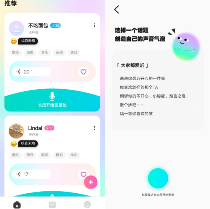 首先是,嗨圈圈主打语音匹配玩法,通过首页的下拉式功能,可以刷新出不同性别的用户,这些用户的状态、性别、星座、标签和语音会以卡片的形式排列,这个卡片称为“声音气泡”。
