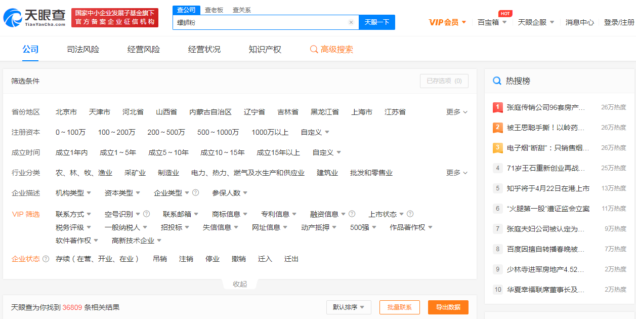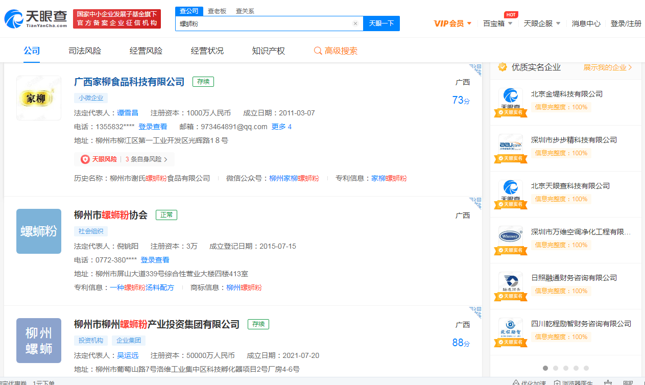 反观螺蛳粉,界面海南在天眼查App网站上搜索发现,相关搜索结果高达36809条,其中机构类型以企业和社会组织为主。企业类型中有小微企业、高新技术企业等,还有柳州市螺蛳粉协会、柳州市螺蛳粉饮食文化博物馆等社会组织。