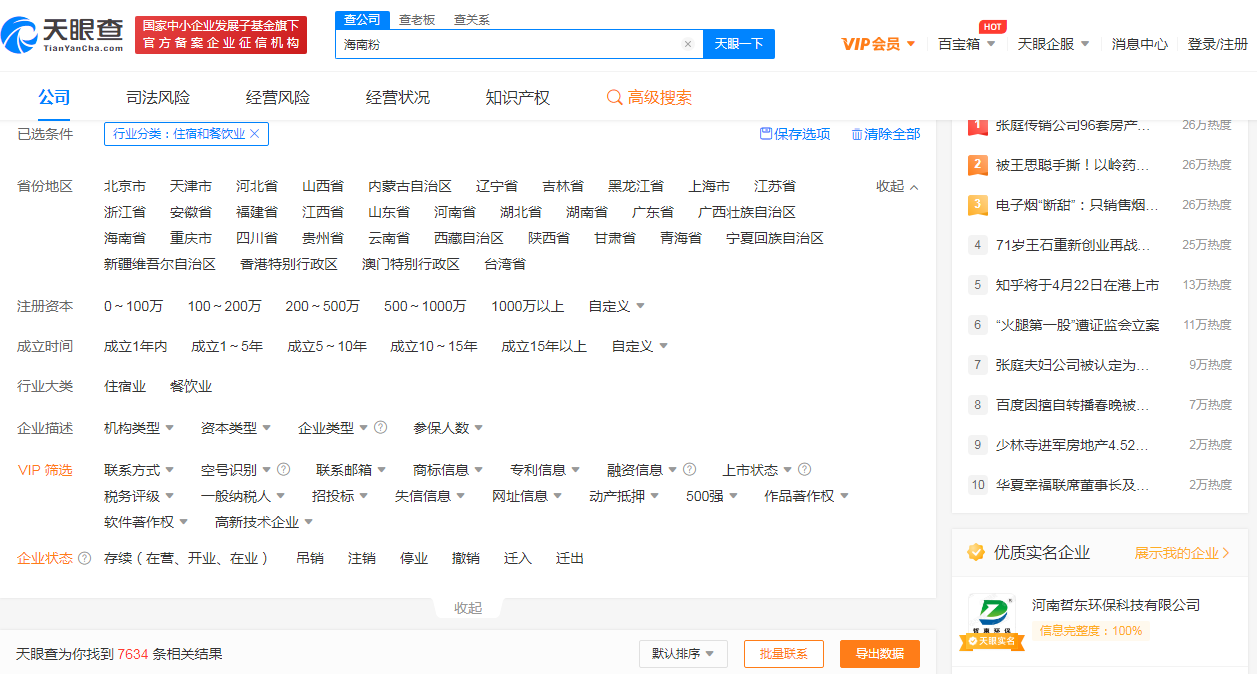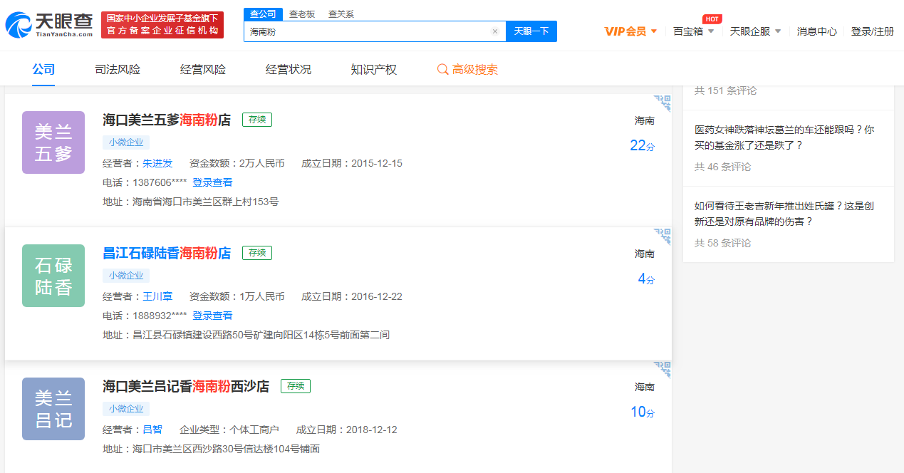 界面海南通过天眼查App查询,在全国各地经营海南粉的店铺,发现全国经营海南粉的店铺主要以海南和两广地带为主,相关的搜索结果仅有7634条,并且多为小微企业经营。