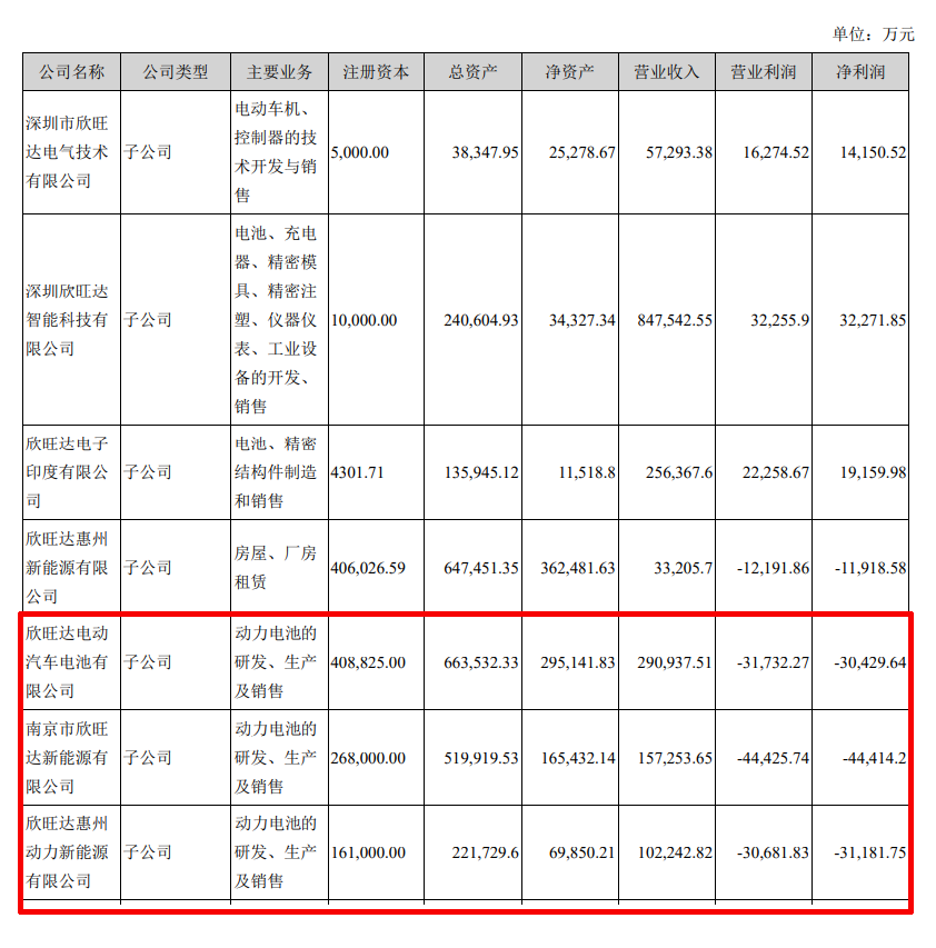 从欣旺达现有业务结构看,动力电池业务占比并不高,盈利表现也不佳,2018-2020年,欣旺达动力电池业务扣非后亏损,分别亏1.46亿元、3.05亿元、6.07亿元。2021年,动力电池业务3家子公司(欣旺达电动汽车电池有限公司、南京市欣旺达新能源有限公司、欣旺达惠州动力新能源有限公司)亏损超过10亿元。