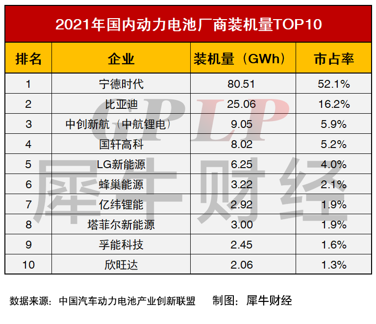 另据中国汽车动力电池产业创新联盟数据,2021年宁德时代以80.51Gwh的装车量占据国内动力电池市场份额的52%,呈现出宁德时代一家独大行业格局。