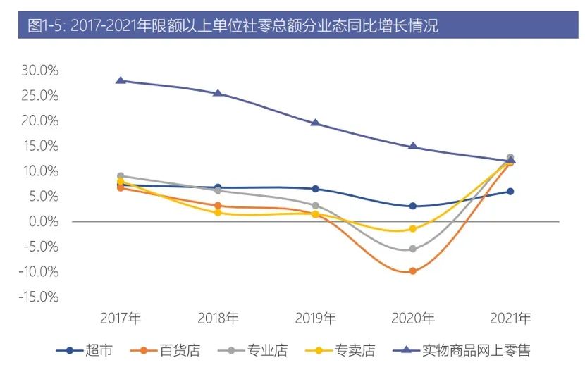 据《2021-2022年中国百货零售业发展报告》显示,从2017年到2021年,中国百货业的增长呈逐年下降趋势,2020年出现了9.8%的负增长,相比于超市、便利店、专业店等其他业态,增长率最低。直到2021年才有所缓和,全年增长11.7%。