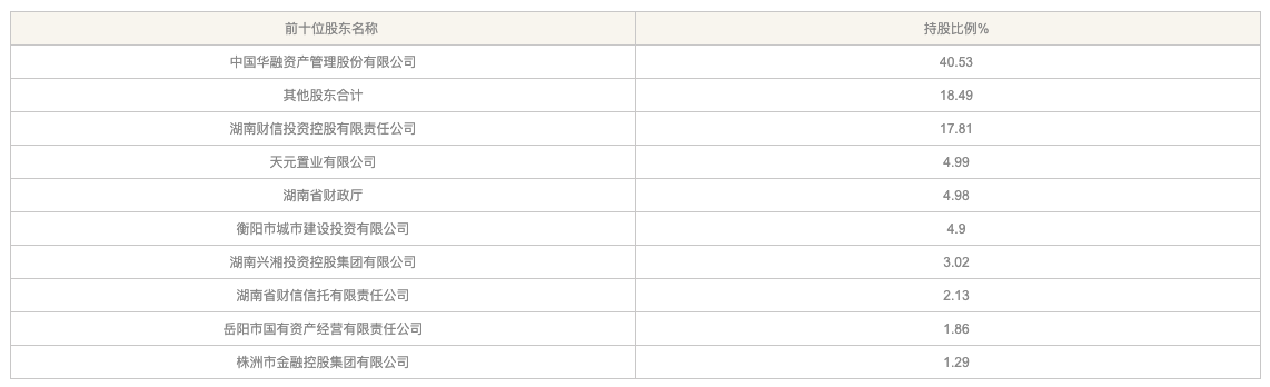 值得关注的是,项目信息显示,其他股东放弃行使优先购买权。除中国华融外,该银行主要股东还包括湖南财信投资控股有限责任公司(持股17.81%)、天元置业有限公司(持股4.99%)、湖南省财政厅(持股4.98%)、衡阳市城市建设投资有限公司(持股4.9%)、湖南兴湘投资控股集团有限公司(持股3.02%)、湖南省财信信托有限责任公司(持股2.13%)、岳阳市国有资产经营有限责任公司(持股1.86%)、株洲市金融控股集团有限公司(持股1.29%)等。