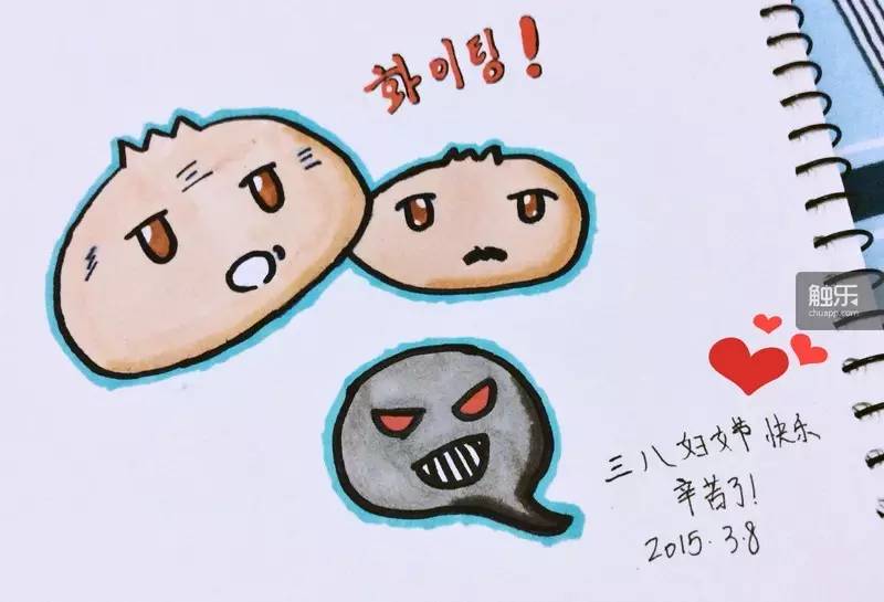 第一幅画是“三八节”那天送给妈妈的,画的是大包子带着小包子一起对抗白血病。满脸皱纹的大包子表情愤怒,护在有些胆怯的小包子身边,对面是狞笑着的白血病。