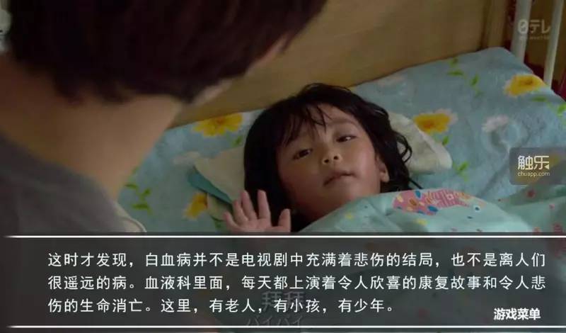 耕太的故事被杨蒙浓缩在了一款小小的游戏中。与电视剧的单线剧情不同,游戏为玩家设置了一些分支选项。这些选择是每一名白血病患者所必须面对的,虽然对他们而言,可供选择的东西并不多。