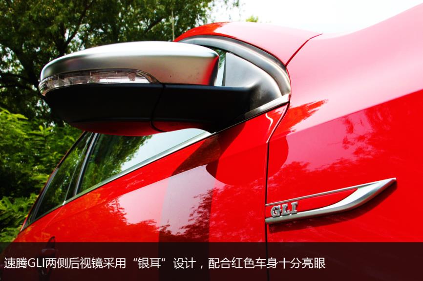 速腾GLI两侧后视镜采用“银耳”设计,配合红色车身十分亮眼。