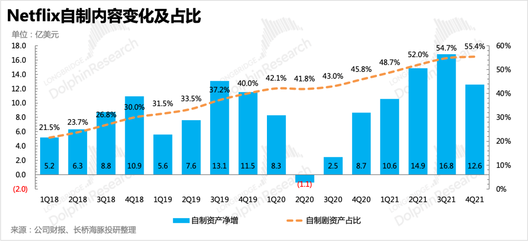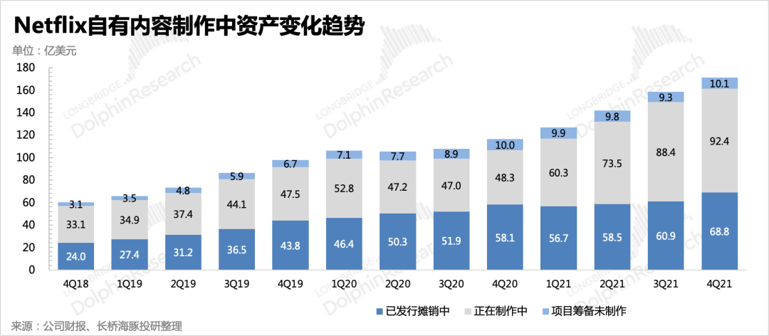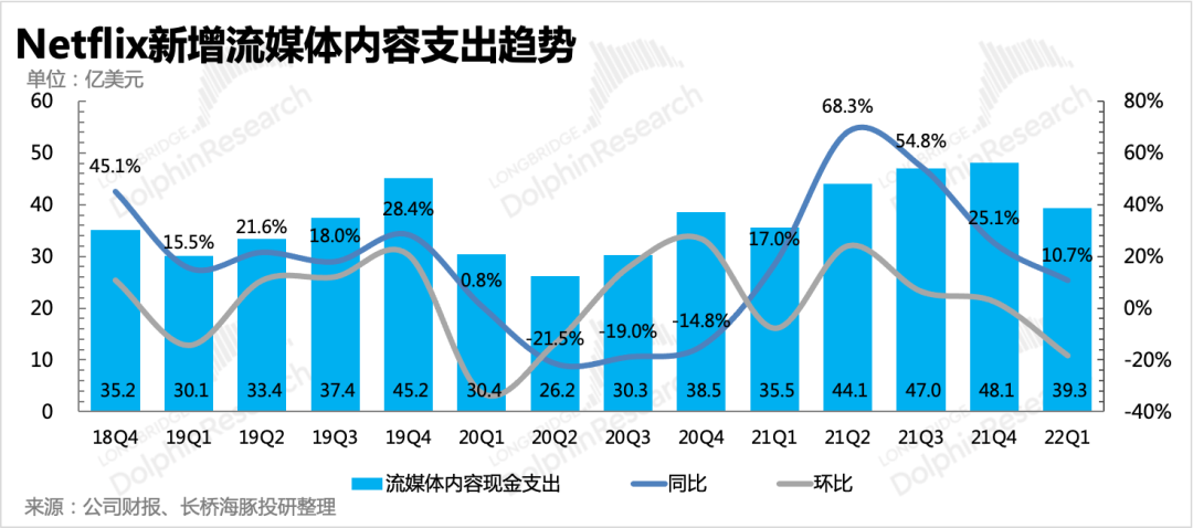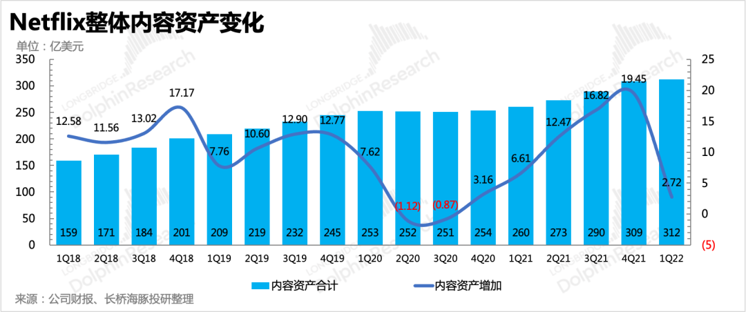 在收入端增长有显而易见的压力之下,以及可能受去年底以来的Omicron疫情影响,奈飞在内容支出投入(流媒体内容现金支出)上,短期也表现出来继续放缓。截至一季度末,整体内容资产规模312亿,环比新增投入大幅萎缩。