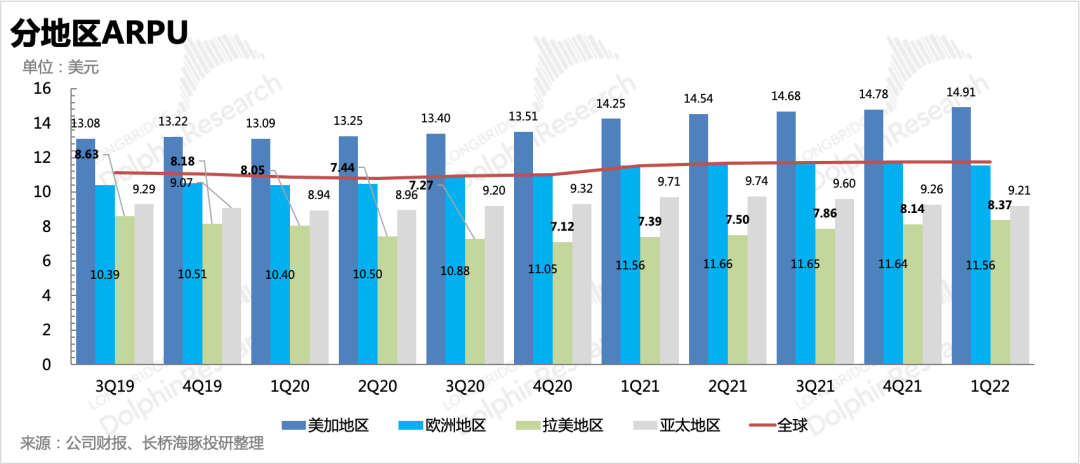 一季度在不同地区的单用户付费金额上,除了亚太地区,其他地区均有不同幅度的增长。