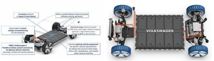 大众的电动车王牌 ID.系列、奥迪E-tron系列、斯柯达的vision、是目前 MEB 平台上的主要车型,包括 ID.3、ID.4、ID.Crozz、ID.Buzz、ID.Vizzion、ID.Lounge 等。