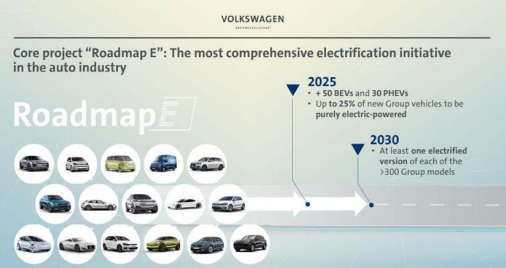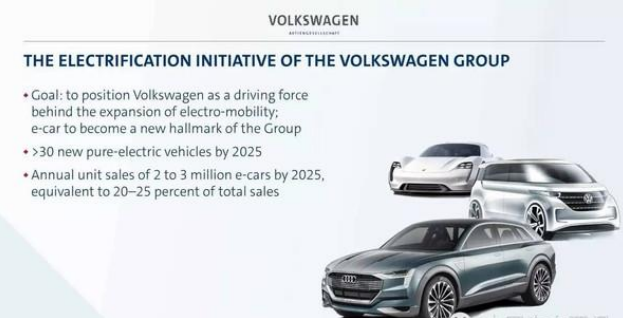 2016年,大众发布了 “TOGETHER – Strategy 2025”战略,把电动化作为未来 10 年里最核心的战略基石之一,计划2025年其纯电动车的销量将在 200 万辆至 300 万辆之间,占集团汽车总销量的 20%-25%。