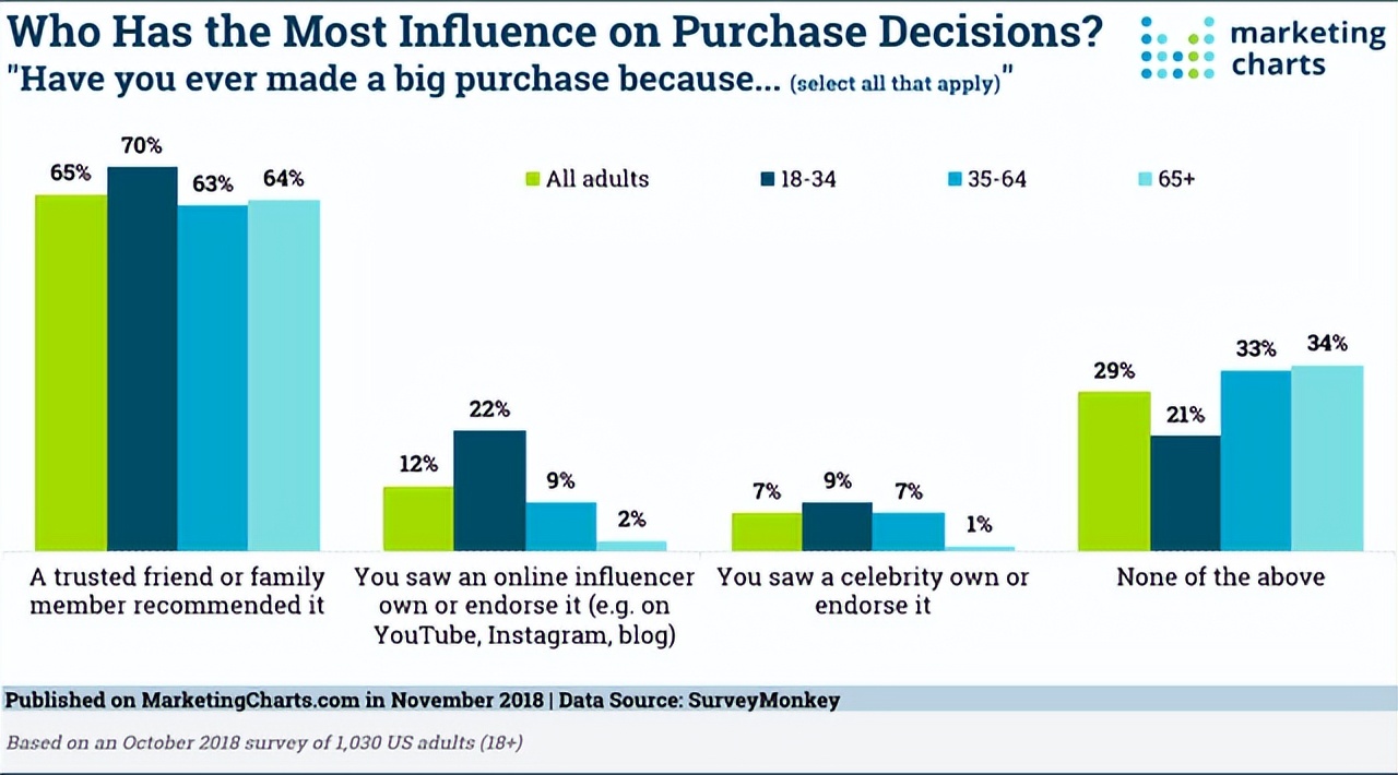 有几个关键原因说明了这一点的强大。首先,与朋友互动有望获得更高的参与度。其次,多项研究表明,密友比影响者或公司更能影响购买决策,如下图所示。这对于潜在的广告客户和传播来说是非常强大的,因为下图显示70%的18到29岁的人在做购买决定时会受到亲密朋友的影响。