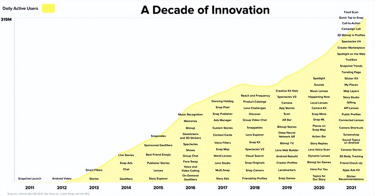 Snap由Evan Spiegel和Bobby Murphy于2011年9月16日创立,他们将“Picaboo”重新命名为 Snapchat,他们将“Picaboo”重新命名为Snap。该公司开创了“相机聚焦”社交媒体应用,当时被称为“下一个Facebook”。以前,像Facebook这样的应用程序非常注重新闻提要,是的,图片/视频是上传的,但并不注重实时性。